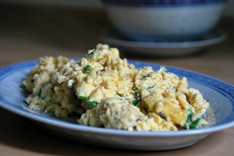 Eine heiße Pfanne zweimal in Öl ausschwenken und die Eier hineingießen. Mit dem Spatel hin- und herschieben, bis die Masse stockt, den Wok vom Feuer nehmen, auf einer vorgewärmten Platte anrichten und sofort servieren.