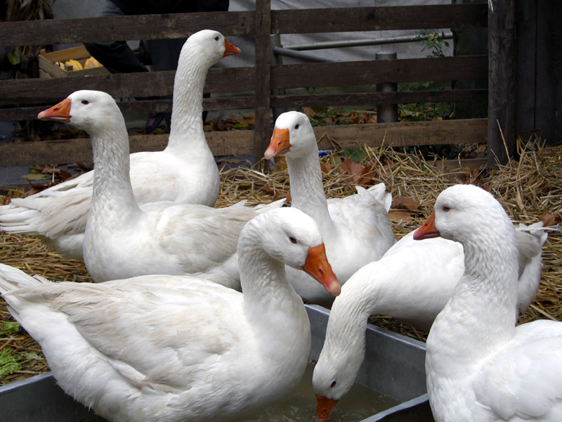 - völlig weiße, leichte bis mittelschwere, bewegliche, frühreife Rasse mit eleganter Figur; Ganter 7 kg, Gans 5,5 bis 6 kg Lebendgewicht, Legeleistung 40 Eier von je 140 g.