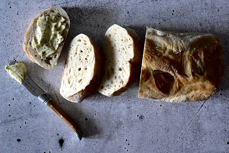 - Knoblauchbutter besteht aus Butter und zerkleinertem Knoblauch.
