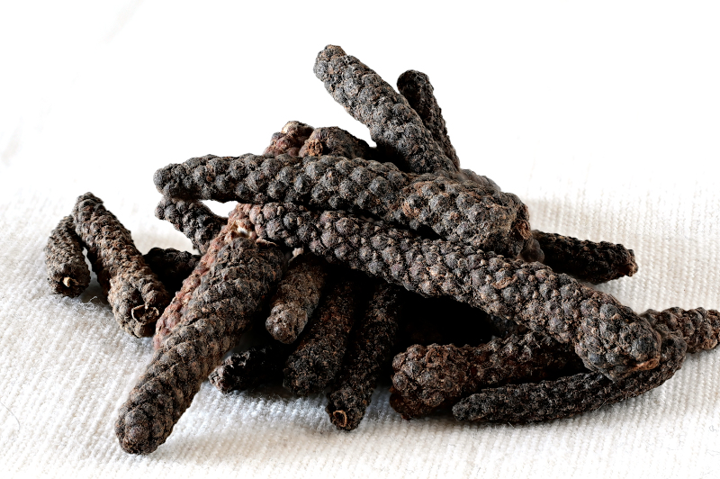 2. Langer Pfeffer (Piper longum, auch Pippali genannt): Verleiht der Mischung eine feiner nuancierte, leicht süßliche Schärfe und wird in der ayurvedischen Tradition besonders geschätzt, da er als schonender und zugleich wirkungsvoller gilt.