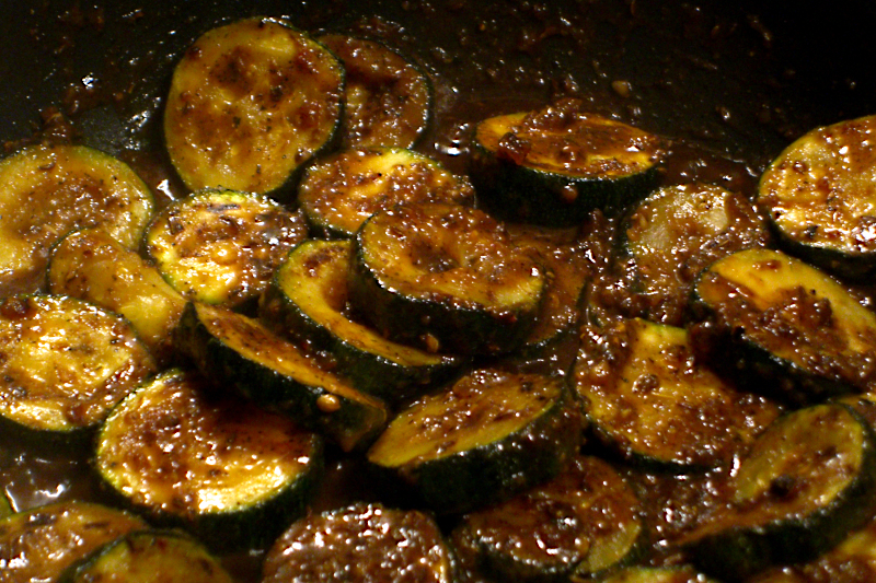 Die Zucchini in kochendem Salzwasser 2 Minuten blanchieren, abgießen, kalt abschrecken und abtropfen lassen. Öl in einer Pfanne erhitzen und die Zucchini darin kurz anbraten, dann die Sauce dazugeben und alles kurz aufkochen lassen. Nochmals mit Pfeffer abschmecken und zu Fleisch- oder Fischgerichten vom Grill servieren.