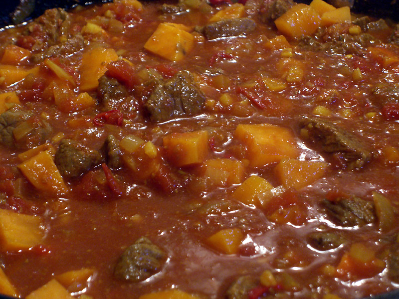 Das Fleisch waschen, abtupfen und von Fett und Sehnen befreien. Anschließend in Würfel von 3 cm Größe schneiden. Die Zwiebeln, den Knoblauch, Ingwer und Kurkuma schälen. Zwiebeln, Knoblauch und Ingwer fein hacken und die Kurkumawurzeln fein reiben. Die Chilischoten von den Stielansätzen befreien und nach Geschmack die Kerne sowie die Scheidewände entfernen (Achtung: Hände waschen nicht vergessen!). In feine Streifen schneiden. Kreuzkümmel, Koriander und Fenchel in einem Mörser zu feinem Pulver zerstoßen. Die Tomaten blanchieren, häuten, anschließend die Stielansätze und Samen entfernen, klein würfeln. Die Süßkartoffelm schälen und in 2 cm große Stückchen schneiden.