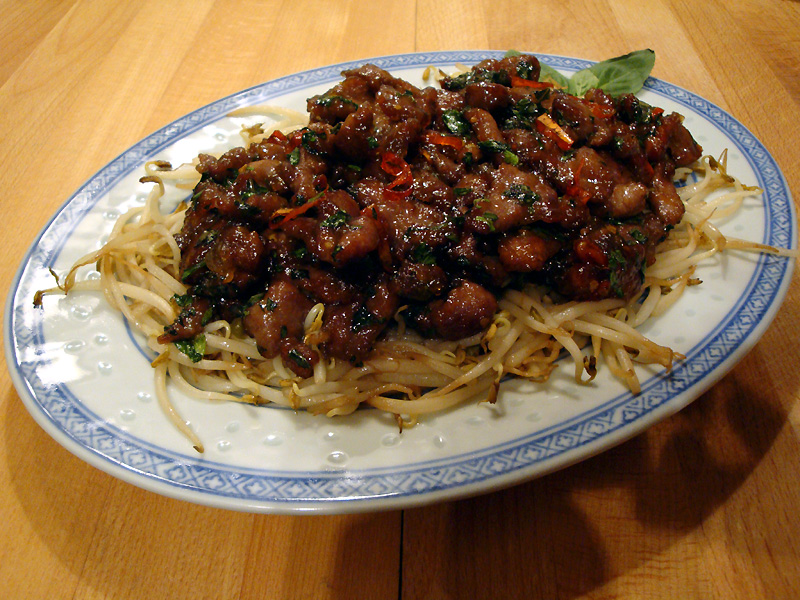 Eine heiße Pfanne zweimal mit Öl ausschwenken. Das Frittieröl erhitzen und das marinierte Entenfleisch 1 bis 2 Minuten darin frittieren. Während des Frittierens das Fleisch mit einem Küchenlöffel umrühren und bewegen, damit das Fleisch nicht zusammenklebt und es gleichmäßig anbräunt. Mit einem Sieb aus der Pfanne heben und das Öl in das Vorratsgefäß zurückgeben. Jetzt das Öl für die Sauce in der Pfanne erhitzen, die Chilischoten kurz anbraten und das frittierte Entenfleisch zugeben. Unter Rühren erhitzen, die Saucenmischung zugießen und mit dem angerührten Kartoffelmehl binden. Zum Schluss die Basilikumblätter unterheben und die Ente heiß servieren. Das Gericht schmeckt auch mit Hühnchen- oder Putenfleisch.