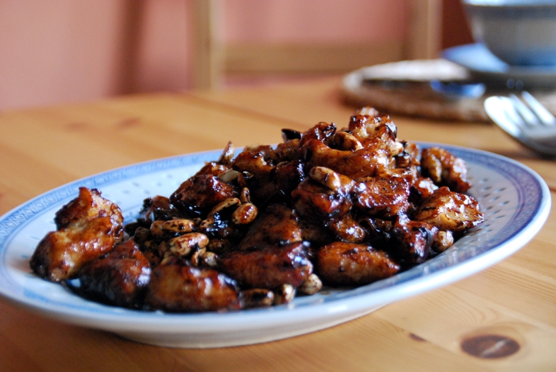 Die Hühnchenbrustfilets unter fließendem Wasser waschen, Haut und Sehnen entfernen und dann in ca. 1,5 cm große Würfel schneiden. Das Kartoffelmehl mit Wasser anrühren. Den Knoblauch schälen und fein hacken. Die Hühnchenbrustwürfel würzen: zuerst 2 g Salz dazugeben, glatt rühren, dann das Eiweiß eines Eis dazugeben, glatt rühren, danach das mit Wasser angerührte Kartoffelmehl hinzufügen und alles glatt rühren. Die Haut der Erdnusskerne entfernen. Wenn es frische Erdnusskerne sind, sollten sie zuerst kurz in siedendem Wasser blanchiert werden.