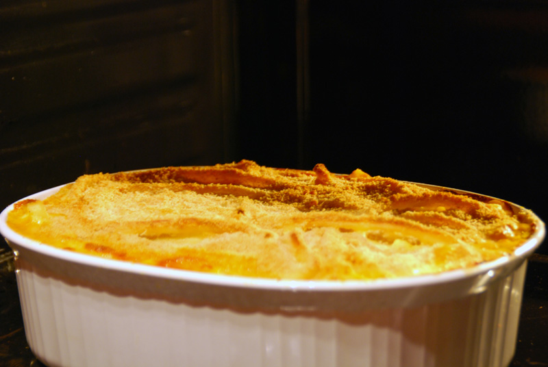 Die Zutaten werden anschließend in einer Auflaufform geschichtet und im Ofen gebacken, bis das Gericht goldbraun ist.
