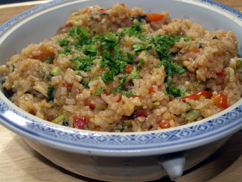 Die Zubereitung ist einfach: Das Gemüse wird in einer Pfanne angebraten, dann wird der Reis hinzugefügt und alles zusammen mit den Gewürzen und Saucen vermischt.