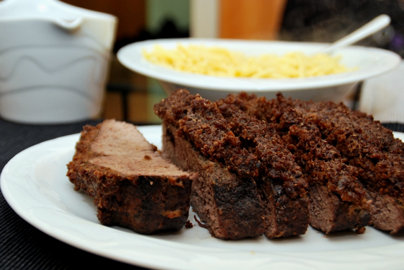 Ein Wildgericht vom Hirsch mit einer gewürzten Kruste aus Schwarzbrot, Ei und Rotwein. Für den saftigen Braten wird das Fleisch mit Speck im Ofen angebraten, dann mit Rotwein gar gezogen und schließlich mit einer Kruste überbacken. Die Kruste verleiht dem Braten einen schönen Anblick und zusätzliches Aroma.