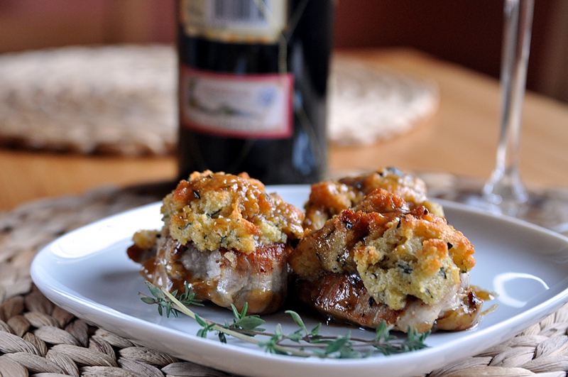 Das Fleisch waschen, trocken tupfen und in etwa 2 - 3 cm dicke Scheiben schneiden. Die Petersilie und den Thymian waschen, trocken tupfen und die Blättchen fein hacken. Die Kräuter mit der Butter, dem Käse und den Semmelbröseln in einer Schüssel vermischen, kräftig mit Pfeffer würzen. Das Kartoffelmehl mit 2 EL Wasser verrühren. Einen Ofen auf 200 °C (Umluft 175 °C ) vorheitzen.
