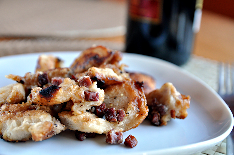 Öl in einer Pfanne erhitzen und die Schinkenwürfel darin kurz anbraten, dann herausnehmen und beiseite stellen. Im selben Öl bei mittlerer Hitze nun das Brot anbraten, bis es locker und krümelig wird. Die Hitze darf nicht zu groß sein, denn sonst brennt das Brot schnell an. Mit Salz und Pfeffer abschmecken und die Schinkenwürfel dazugeben. Heiß servieren.