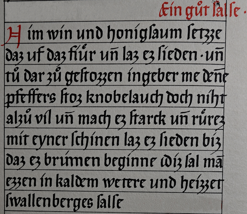Dies ist ein Rezept (Nr. 49 aus der Handschrift »Buch von guter Speise« die zwischen 1347 und 1350 entstanden ist und bis 1354 durch Nachträge ergänzt wurde.