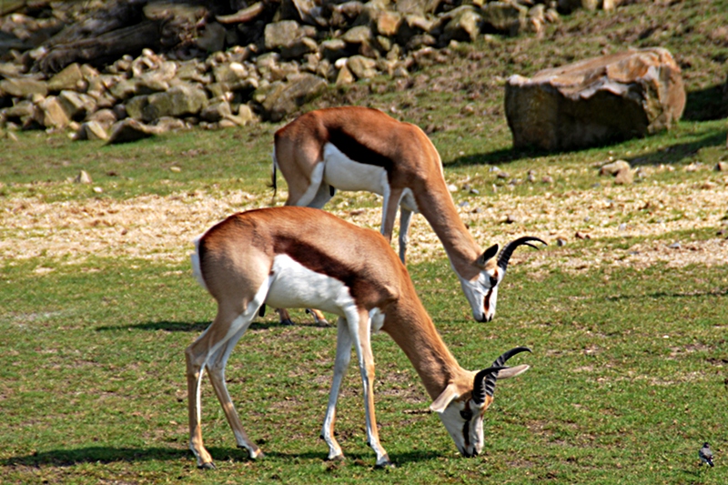 Der Springbock ist eine afrikanische Antilope aus der Gruppe der Gazellenartigen. Seine Gestalt ähnlelt sehr der einer Gazelle, aber weil das Gebiss des Springbocks von dem einer Gazelle abweicht, bildet er eine eigene Gattung. Er erreicht eine Höhe von etwa 85 cm und eine Länge von bis zu 130 cm. Die Männcen erreichen ein Gewicht von bis zu 40 kg, die Weibchen sind mit etwa 30 kg etwas zierlicher. Beide Geschlechter tragen gewundene niedrige Gehörne auf dem Kopf.